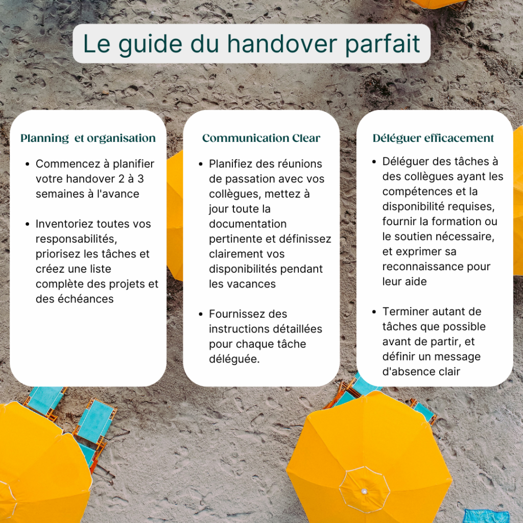 Pas de panique ! Voici quelques bonnes pratiques pour assurer un handover sans stress et des vacances vraiment relaxantes :